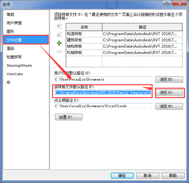 B:选择文件位置,点击族样板文件默认路径后面的浏览按钮,然后选择C:ProgramDataAutodeskRVT 2016Family TemplatesChinese这个路径。