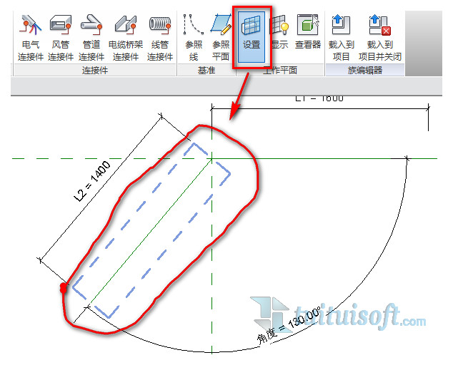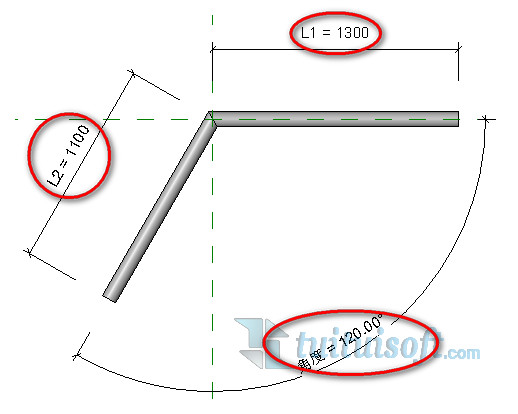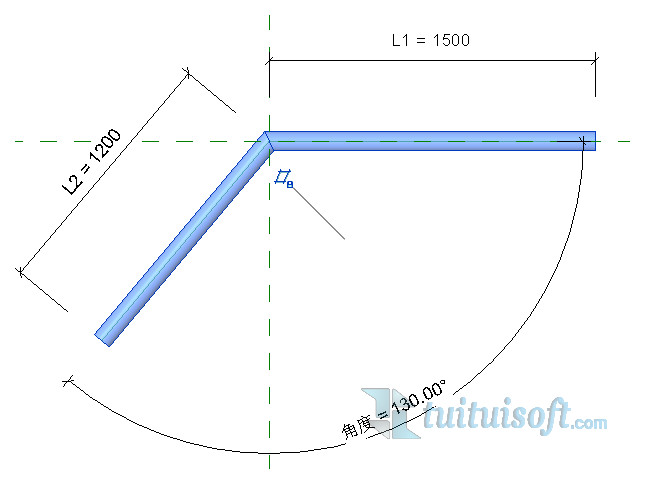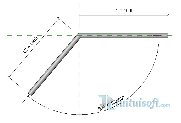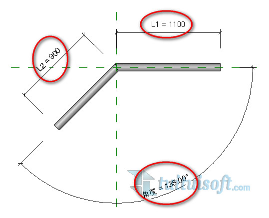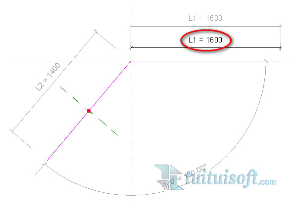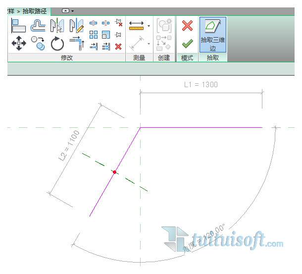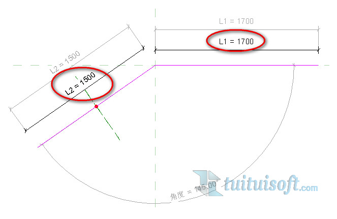 这里之所以只标注L1,是因为之前我们在设置工作平面的时候我们设置的是L2那一参照线的工作平面,所以当我们拾取锁定L2那一段的时候,那一段的放样路径会和L2匹配长度,但L1不会,所以我们要进行L1段的标注。