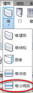 4、将轮廓族保存并载入到项目中,在建筑选项卡中选择墙:分隔条,并将分割条放置在墙体上