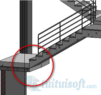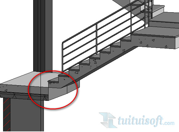 Revit楼梯与楼板处的连接处理不是那么符合实际,会出现一些问题,如下图,这样的连接会导致楼梯配筋时钢筋外露。
