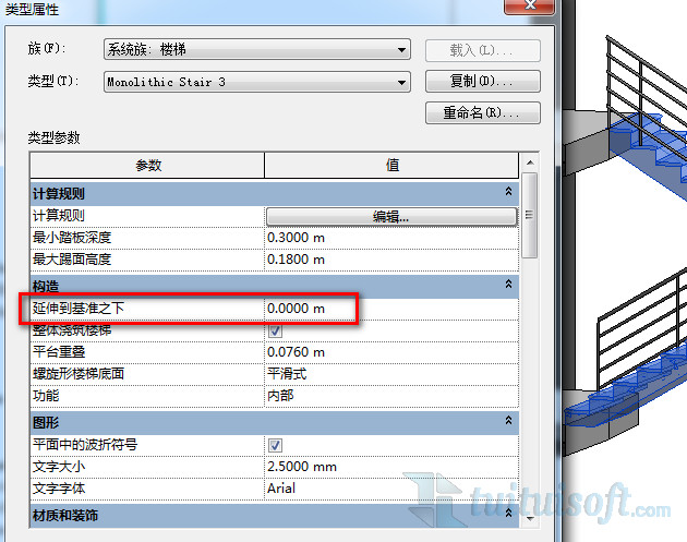选中楼梯,在类型属性的构造中找到“延伸到基准之下”,输入适当的负值即可