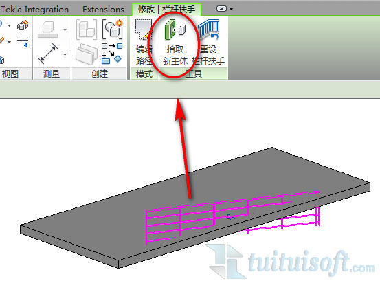选中栏杆,点击上方修改选项卡的“拾取新主体”,接着点击楼板,这时候你就发现栏杆附着到楼板上了!