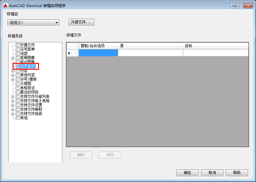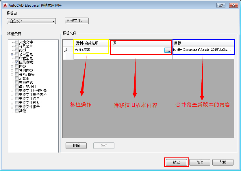 注: 这些是 Autodesk AutoCAD Electrical 2015 之前版本的默认文件夹。文件将被移植到当前文件夹结构。 有两个移植选项,具体取决于文件类型。