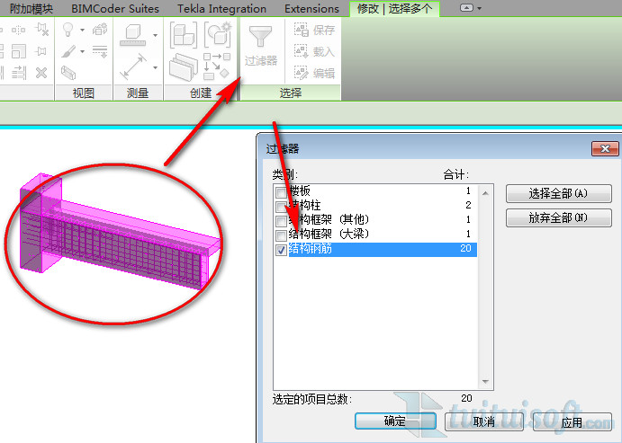 一、首先,选择需要显示的钢筋(因为显示实体钢筋需要消耗大量的电脑资源,全部选择将会造成严重的卡顿),选择的方法有两种,一种是一根一根的去选择,另一种是通过过滤器进行选择。