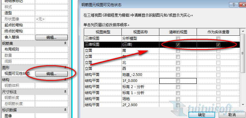 二、选择完钢筋后,在属性面板中可以看到“视图可见性状态”,点击编辑,在弹出的对话框中勾选要使钢筋可在其中清晰查看的视图。