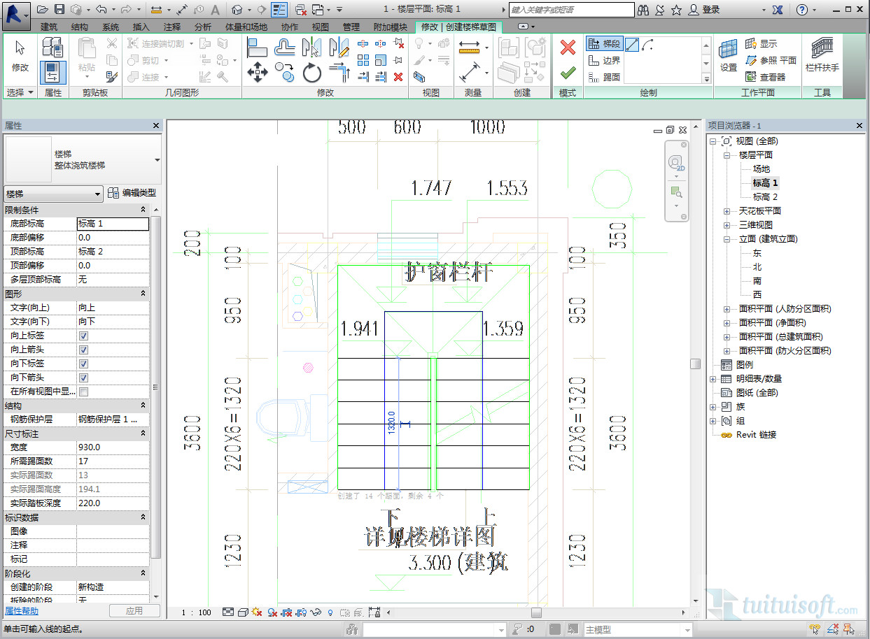 我们打开revit选择楼梯,草图楼梯,调整类型属性(这里就不再放CAD图了,详情请看我上一篇文章。)