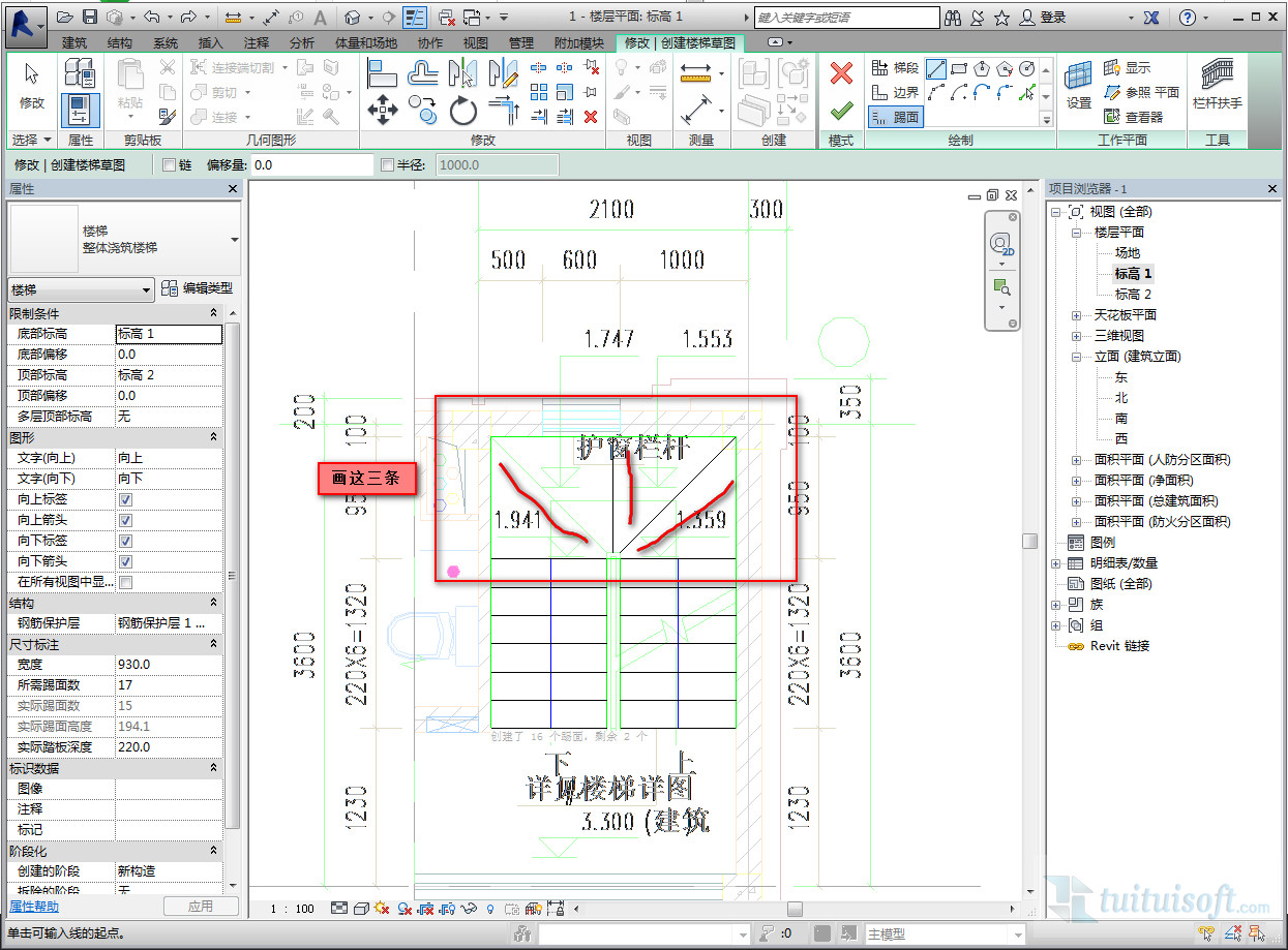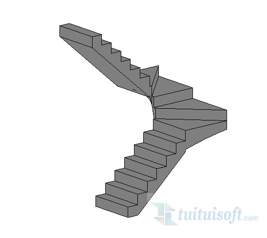 我们选择梯段按CAD图绘制楼梯(我们先忽略他们平台部分三角形的楼梯)画出来大概是这样
