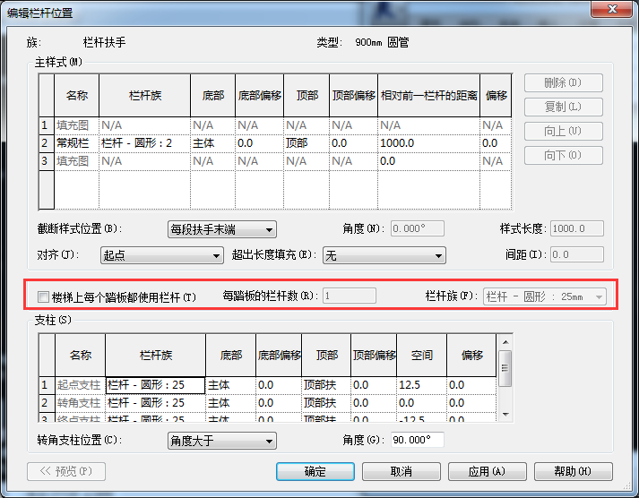 转角支柱位置:当转角支柱为特殊栏杆族时,不满足转角支柱位置条件的栏杆会变为默认栏杆族