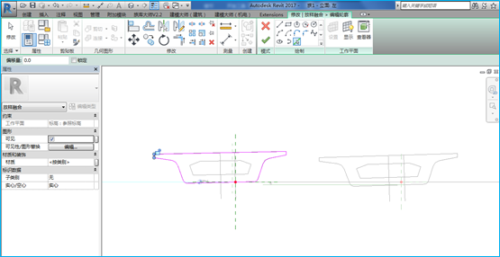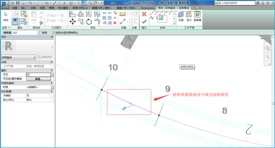 五、切换到参照标高平面视图中,选择放样融合命令,拾取9#与10#墩之间的桥梁路线设计线为绘制路径。
