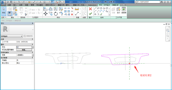 三、切换到参照标高平面视图中,将导入的箱梁横断面图复制到9#墩与10#墩之间的桥梁路线设计线两端,并通过旋转使其与桥梁路线设计线垂直。