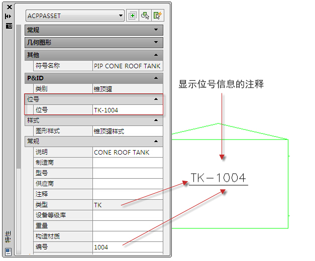 在下面,您可以将位号视为左侧“特性”选项板中和右侧图形的注释中的数据: