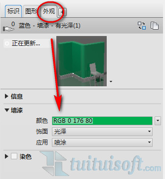 3、材质可以随便添加一个,小编这里选择的是“墙漆”,添加完材质之后记得要修改颜色!颜色可以在“外观”里输入RGB值(不知道RGB的同学小编也无能为力了)