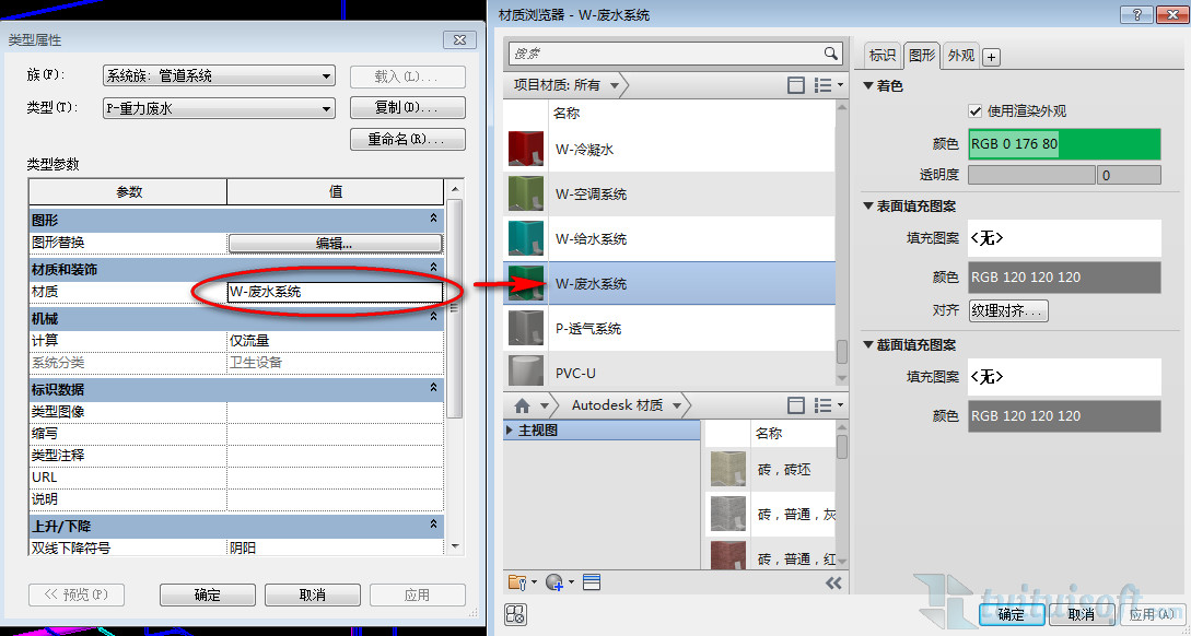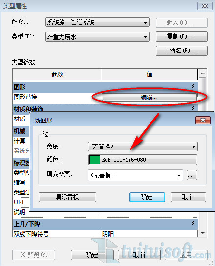 7、这里要注意的是,需要编辑“图形替换”,将线宽颜色改成和材质相同的颜色,不然的话当你缩小模型时会发现所有管道都会显示为绿色的。