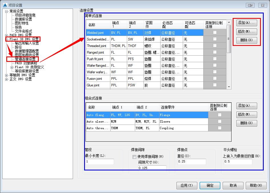 2、无法自定义简单式连接中可用的紧固件列表。另外,不能添加到 Plant 3D 类别定义
