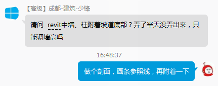 3、这时候再对墙或柱使用“附着顶部/底部”命令,不过要注意的是一定要选择参照平面!(实际上我们是通过附着参照平面来达到附着坡道这么一个效果)