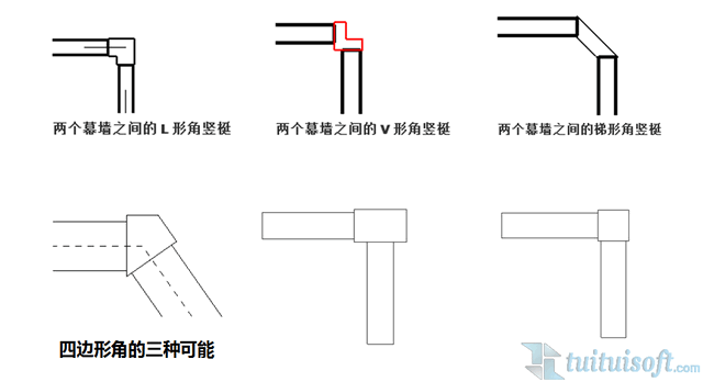 在Revit中竖挺的类型从形状上可以分为圆形,矩形,梯形角,四边形角,L和V角这五种类型,其中圆形和矩形的轮廓可自定义,梯形角,四边形角,L和V角独属于角竖挺,由于转角竖挺的轮廓会根据转角角度变化,因此不可自定义。