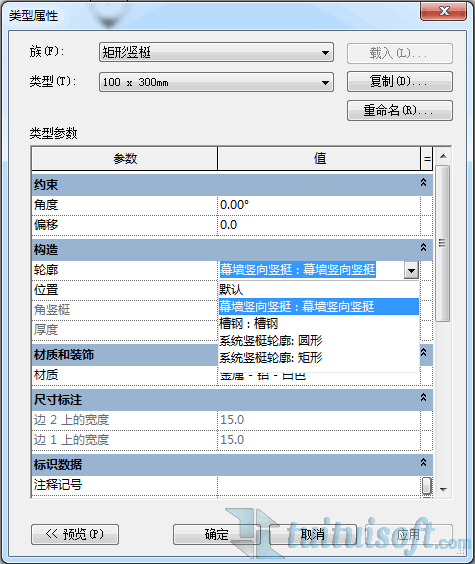 300mm”的矩形竖,进入类型属性编辑窗口中,在构造参数组中,将轮廓形状替换成导入的“幕墙竖向竖挺”,单击确定完成竖挺类型设置。
