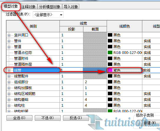 若在模型对象里没有想要的管件和构件名称,可以新建并给相应的颜色和线型图案、材质等。修改完成后则线管材质就会变颜色。