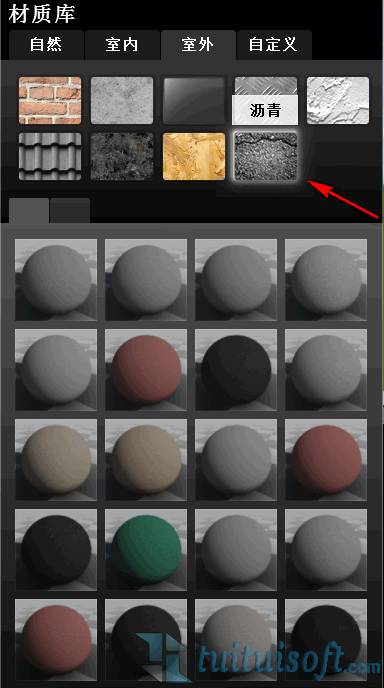 选择在revit里绘制好的道路,接着点击“材质库”会弹出一个框,材质库里包含“自然材质、室内外材质、自定义材质库”则我们的道路属于室外,在室外的材质库里选择“沥青”材质,在沥青的材质里包含着很多种不一样的材质,则小编就随便选一种颜色的材质。
