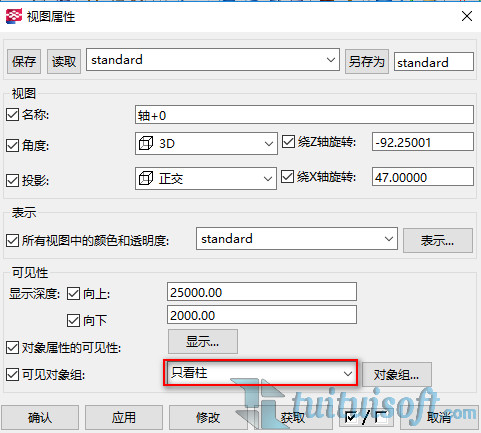点击确认之后,会出现之前的对话框,这时发现在可见对象组当中就有了创建的过滤器“只见柱”,若是想取消隔离的话,也是在对象组当中选择“standard”