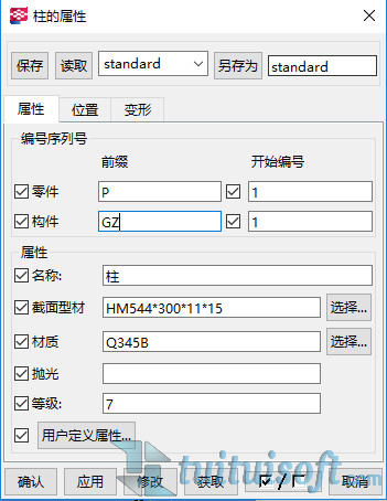 首先给在构件的属性里编辑对应的参数,比如:柱子的属性中的名称、截面型材、材质、等级以及构件、零件的编号等等;比如这里的柱子属性编辑是这样的:
