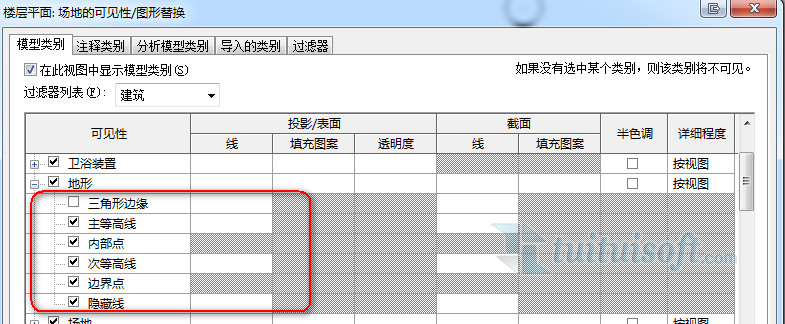 在对应的视图可见性里将等高线显示关闭(推荐)