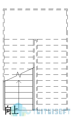 使用默认设置绘制楼梯时,在中间楼层时,楼梯按如图1.4楼梯中间楼层所示,这时候,高于楼梯的虚线表示已经不会对楼梯的显示产生干扰,但是此时的楼梯标记与施工图表达中存在差异,需要进行调整。