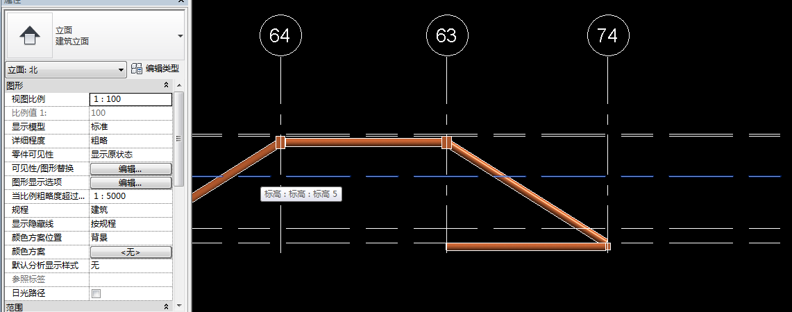 在立面中可以看见在不同标高中的构件没有经过调整是无法连接的。此时,点击构件查看属性,我们可以通过调整起点标高偏移和终点标高偏移,来实现处于不同标高的构件间的连接。