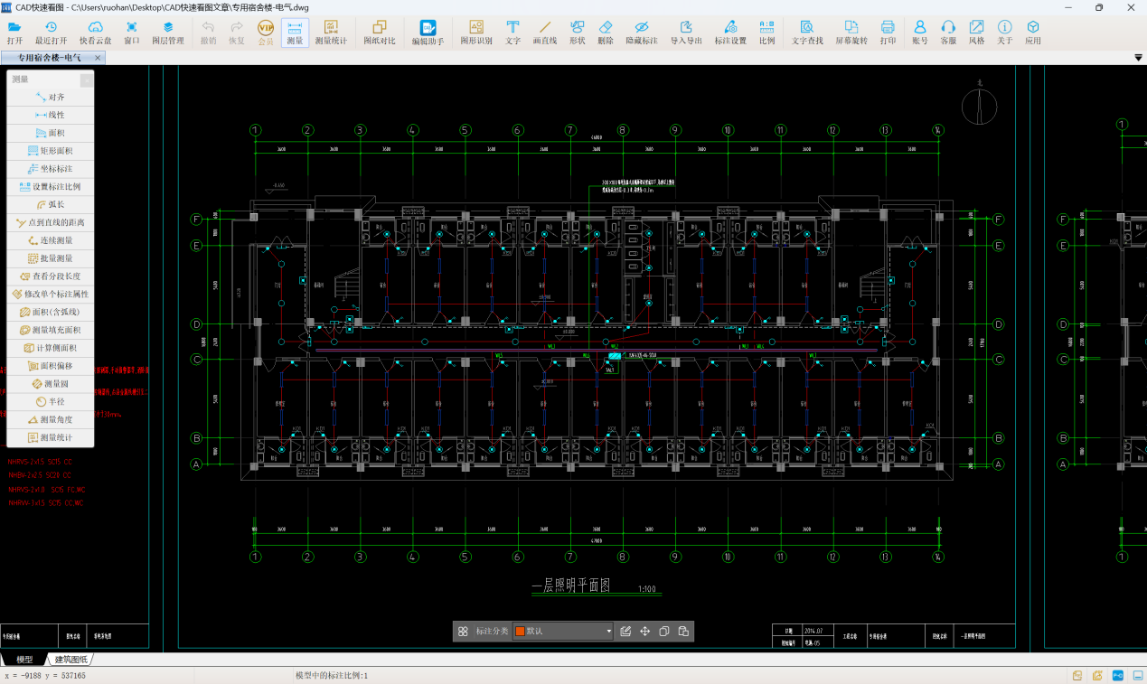 电气安装图纸上会涉及多条管线,一个个量取汇总比较麻烦,CAD快速看图的【批量测量】功能可以批量量取相同管道长度,直接测量汇总长度,节省汇总时间。