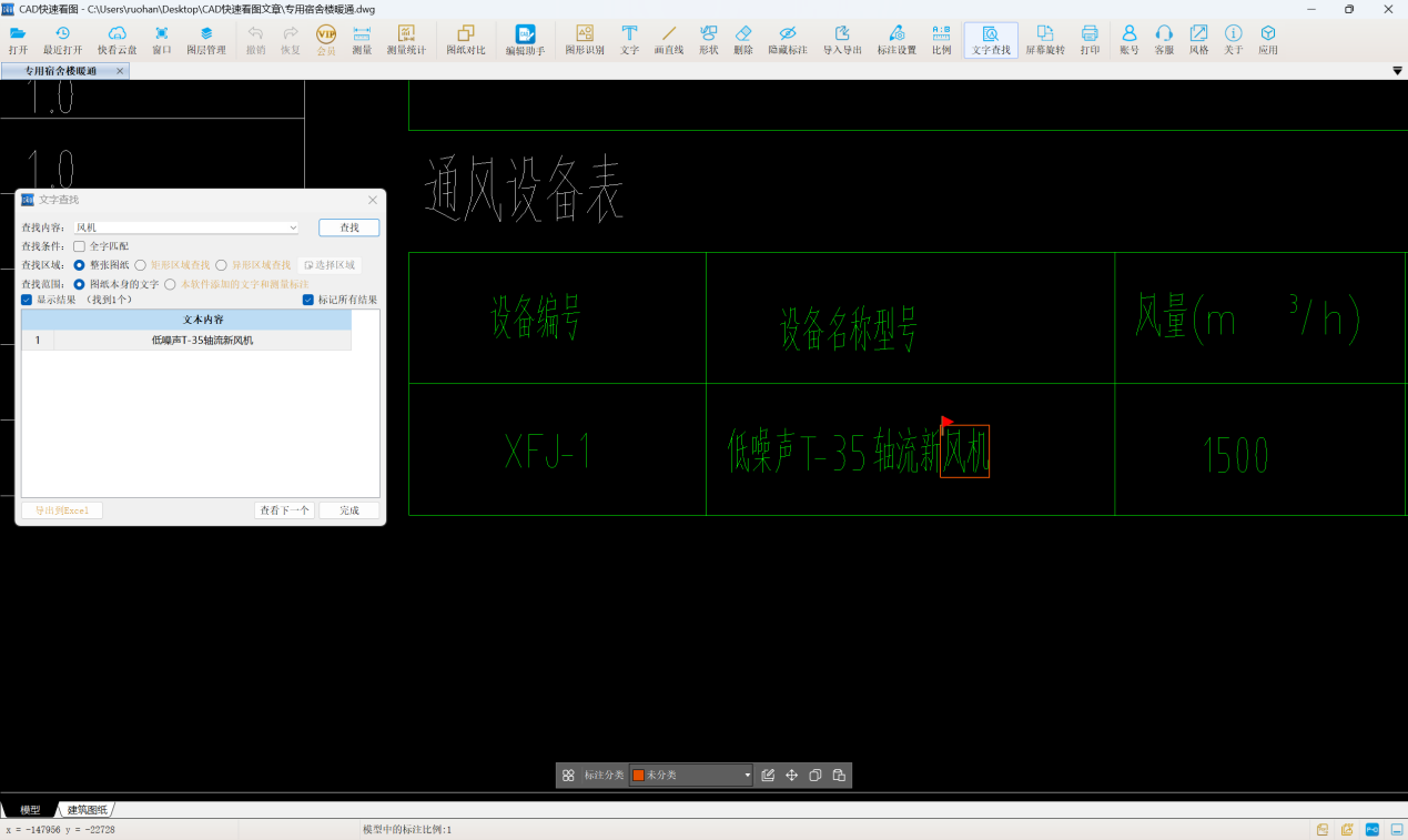 通风机的计量就是如此简单,CAD快速看图的文字查找、提取文字功能,简单方便。