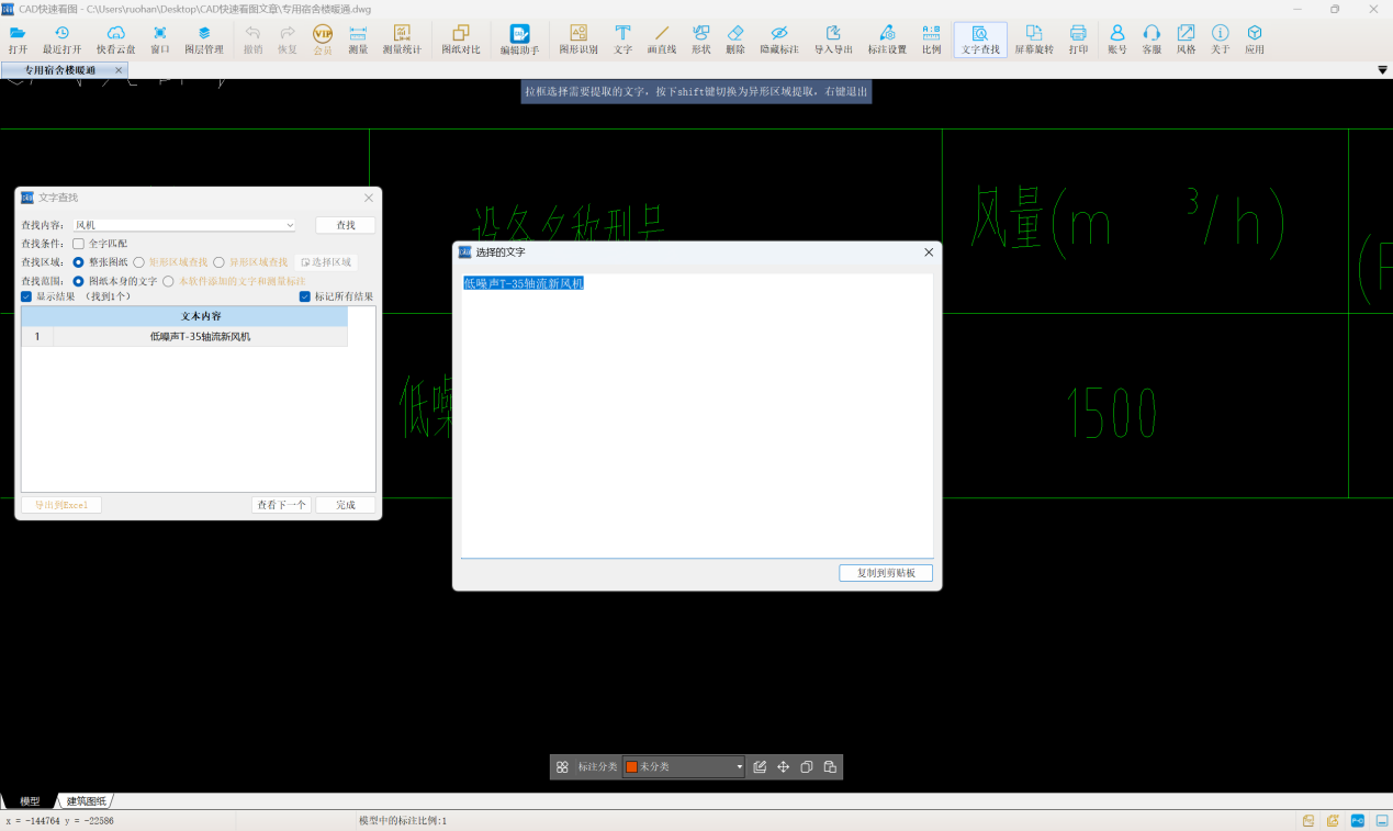 使用【文字查找】功能,输入“风机”,查找区域选择整张图纸,查找范围为图纸本身的文字。然后使用【提取文字】功能,框选查找到的带“风机”的名称,就自动提取到文字信息了,选中,复制到粘贴板,得到该风机完整的名称信息:低噪声T-35轴流新风机。