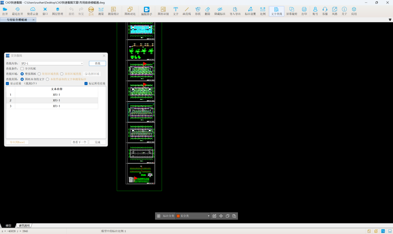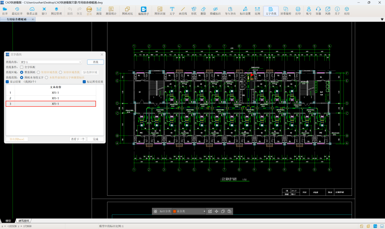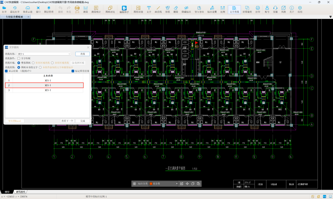 然后继续使用【文字查找】功能,输入“XFJ-1”,得到图纸上有三处“红旗”标记点。表格中结果显示同样为3行,依次点击表格,除去设备表中名称,在一层空调风管平面图和二层空调风管平面图中各有一台。