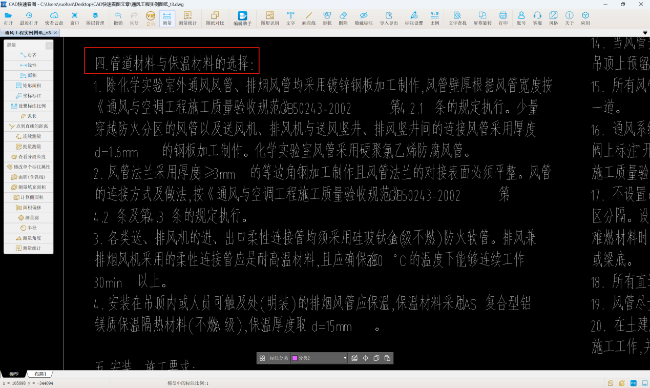 通风空调系统的通风管道的计量可以采用CAD快速看图的批量测量功能测量管道长度,结合文字查找、标注分类,清晰计量位置。