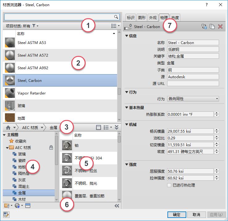 在本示例中,需要从“AEC 材质库”中将亚麻、瓷器材质添加到新的“Revit 项目”用户库中。