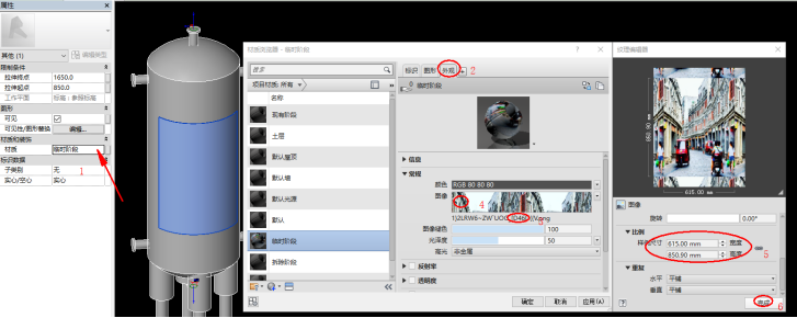2、选中创建的拉伸,点击编辑材质,进入材质浏览器,选中外观,载入图片,选中图像,修改比例,改为正确尺寸,最后点击确认,下图给了顺序,如图所示。