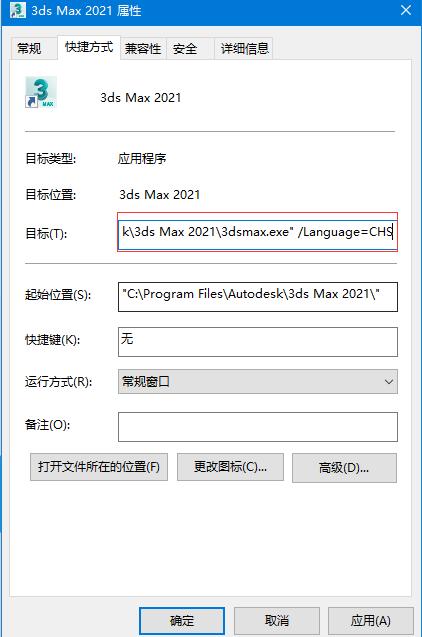 "C:Program FilesAutodesk3ds Max 20213dsmax.exe" /Language=CHS
