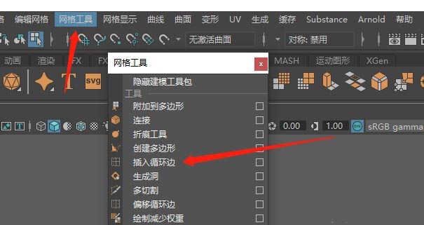 4、接下来点击“网格工具”,选择“插入循环边”。