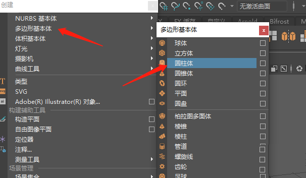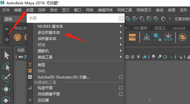 1、首先打开maya软件,进入界面,点击“创建”,点击“多边形基本体”。