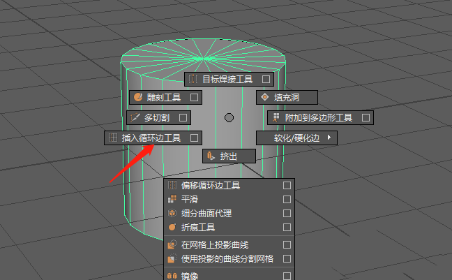 5、将该工具放在圆柱体当中,你会看到有一个循环边。然后我们放手,这时候循环边就添加到了模型中。