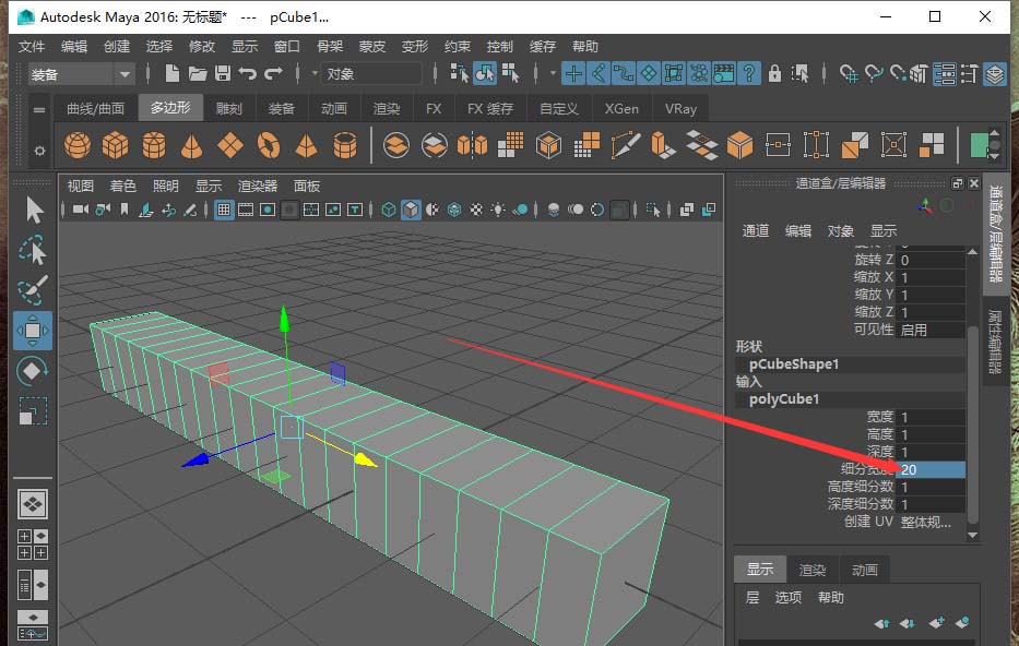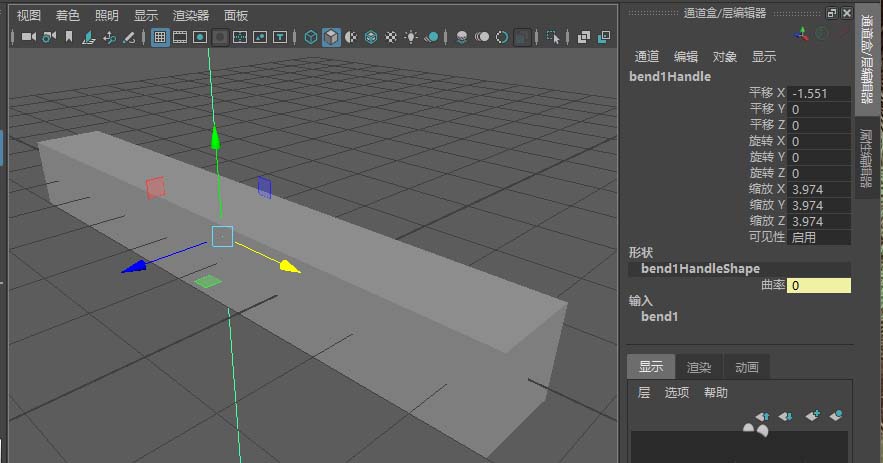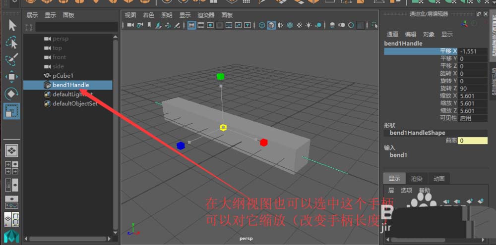 6、如果我们选中pCube1进行缩放,我们看到,弯曲效果被实时的应用了。