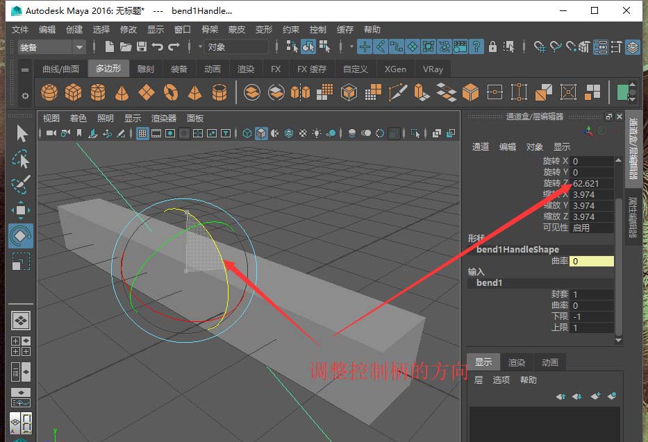 3、单击弯曲指令后,视图中多了一个bend1handle对象。这个是弯曲控制柄。