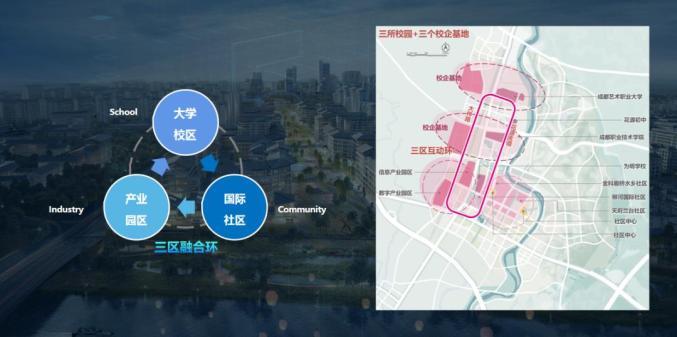 推动“学区+社区+园区”三区融合,消融在地高校边界,促进知识和人才外溢、政产学研用协同创新,以开放式的校园空间,与城市空间、产业空间互动发展,衍生产业集群化的多元共享空间。