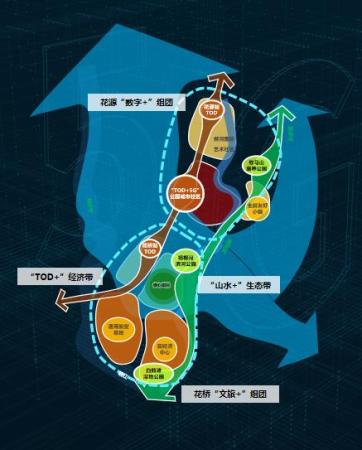 天府牧山数字新城,拥有融入成都“两区一城”协同发展的有利区位,规划布局了以“TOD+”经济带、“山水+”经济带、花源“商贸+”组团、花桥“文旅+”组团为基本构架的“两带两组团”格局。