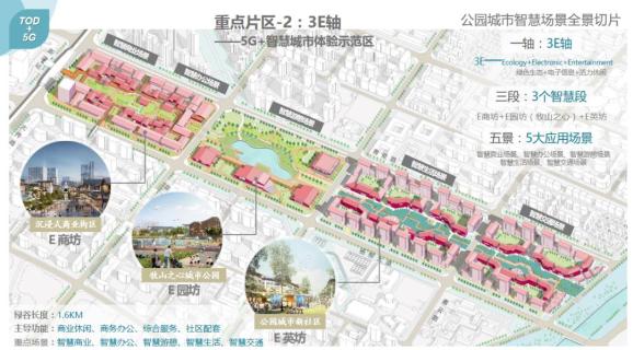 “一轴”即“3E轴”(3E:绿色生态、电子休闲、活力休闲),包含沉浸式商业街区E商坊、牧山之心城市公园E园坊、公园城市新社区E英坊,呈现智慧商业、智慧办公、智慧物流、智慧生活、智慧交通五大应用场景,打造5G+智慧城市体验示范区。