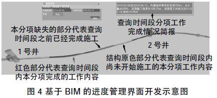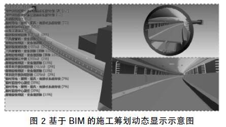 运用基于BIM动态显示技术,根据施工筹划方案及图纸,建立可视化施工筹划方案,在虚拟世界开展工程建设,以检查校核施工筹划在时间和空间上的合理性。利用BIM查询指定时间段内各分项工作的完成情况,包括已完工、正在施工以及尚未开工等部分。使施工进度计划更加合理、紧凑。基于BIM的施工筹划动态显示示意图见图2。