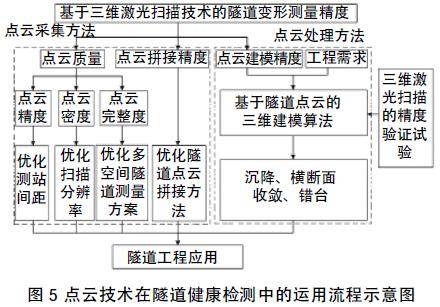 延安东路隧道大修为减少作业安排,使用点云技术取代传统的隧道健康检测技术,开发点云在隧道管片错台、断面收敛及沉降检测中的运用。通过与人工检测数据的对比,验证点云技术在隧道健康检测中的正确性。点云技术在隧道健康检测中的运用流程示意图见图5。