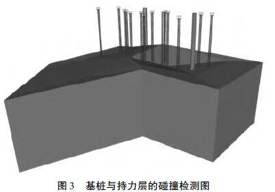 碰撞检测功能在BIM平台中是运用得最为广泛的功能之一,该模块可以验证我们设计方案的合理性,减少设计错误带来的成本浪费,同样在岩土专业中也用得上这个功能。如桩基础与持力层模型进行碰撞检测,可计算出桩群桩端进入持力层的深度,根据碰撞结果再调整桩长保证在满足设计要求的前提下,桩长按最经济的方案定,减少工程造价,如图3所示。
