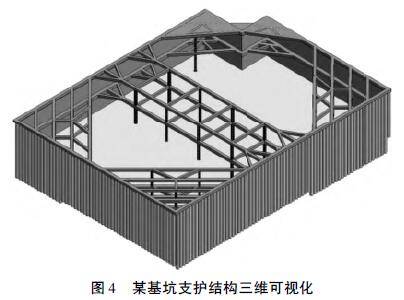 利用BIM平台强大的建模功能,对基坑支护平台进行详细的三维建模。在基坑设计方案的展示和评审中,三维模型的运用可以更好地让专家和业主了解到方案最终建成后的效果和整体的设计意图。将模型导入游戏引擎中进行渲染后,可以达到在模型中以第一人称视觉进行漫游的效果,可以从任意视角观察模型,并且模型附带材质,视觉效果直观,如图4所示。