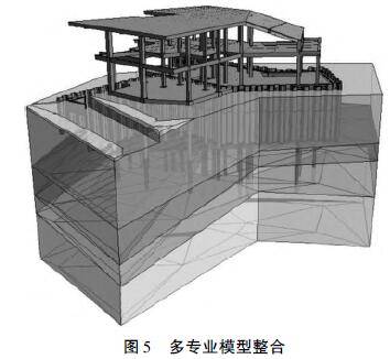 BIM平台的出现使得建筑的多专业之间的联通与配合不再局限于平面图纸上,各专业设计人员可以依据统一的设计原始资料在同一个BIM平台上进行设计。如图5所示,模型结合了地质、基坑支护、基础和主体结构多个模型。通过多专业模型的整合和碰撞,消除不同专业之间的设计冲突,可最大限度地优化设计方案。当出现方案变更时,各专业人员可及时调整方案,实现多方协调工作的效果。