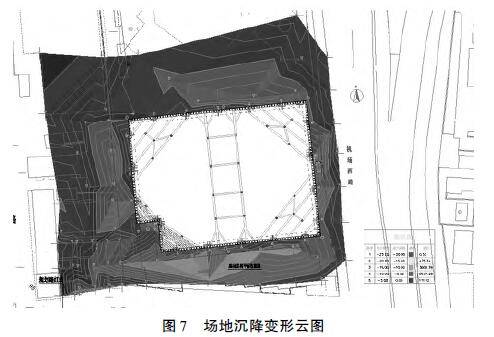 不同于以往监测简报数据表格与图表的汇报方式,现有的软件可以让基坑变形以三维的形式展示。以基坑沉降变形监测项目为例,将现场所测的监测数据,通过监测数据分析软件进行计算,得出变形量;结合监测点的空间位置信息,可在三维建模软件中,利用插值法,计算输出整个场地的沉降云图。这种表现方法可以通过沉降云图掌握所有监测点的变形情况,更清晰地了解场地的沉降变形情况,如图7所示。